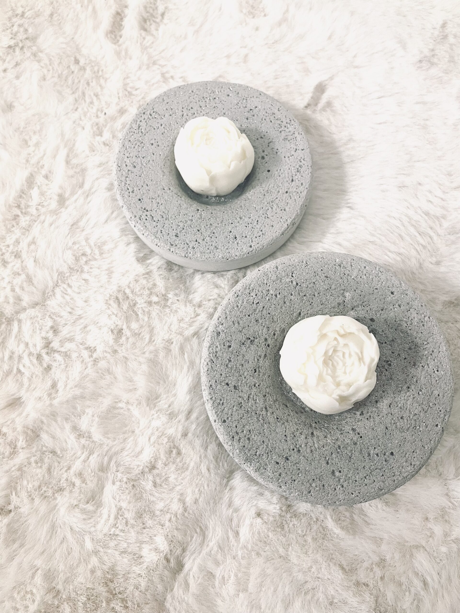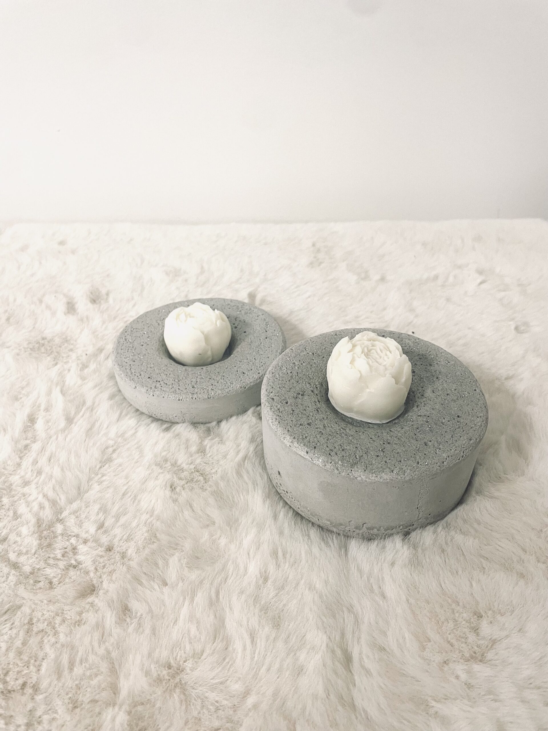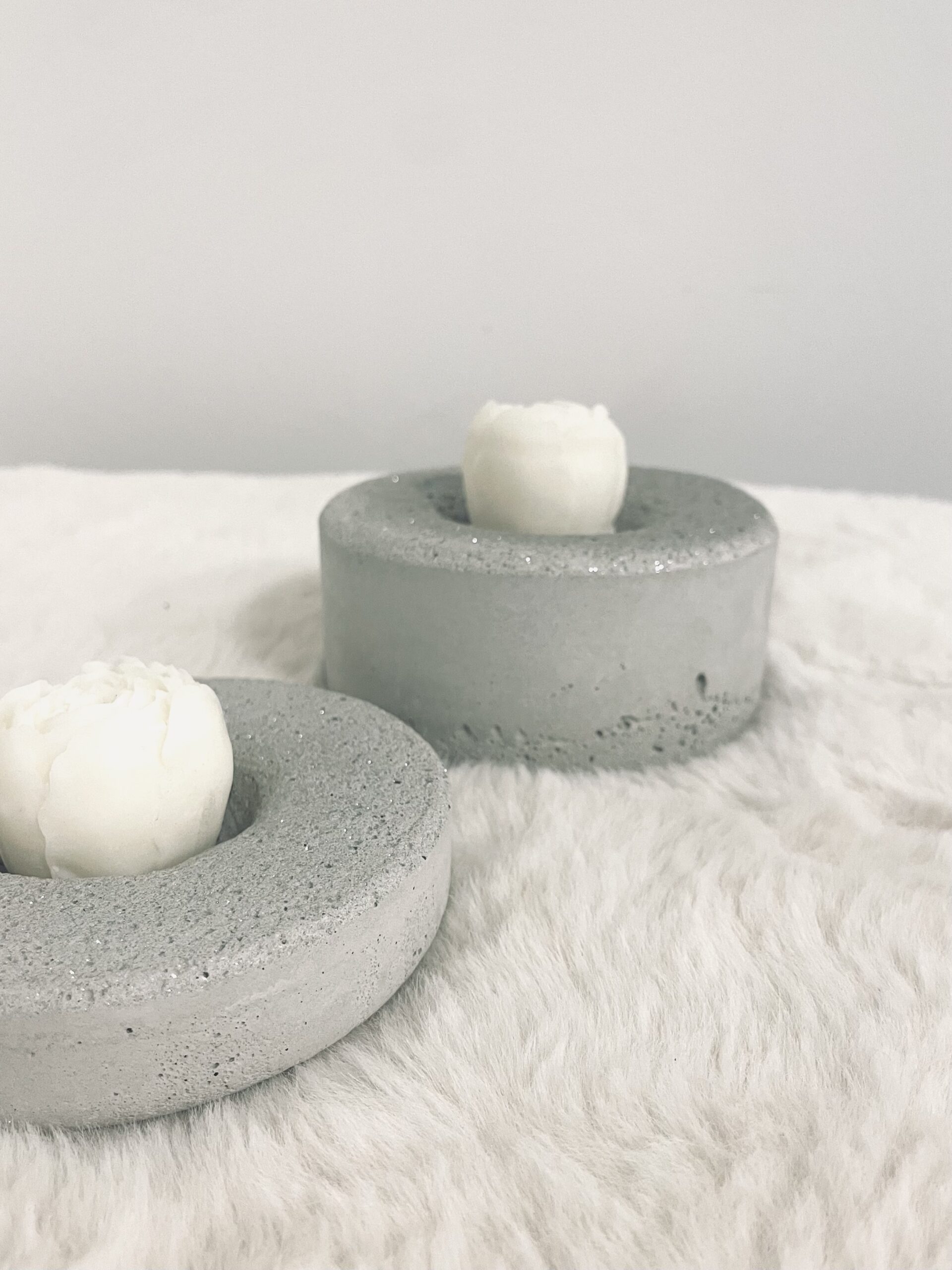 Betonové svícny se svíčkami, možno nahradit LED svíčkami pro venkovní užití.