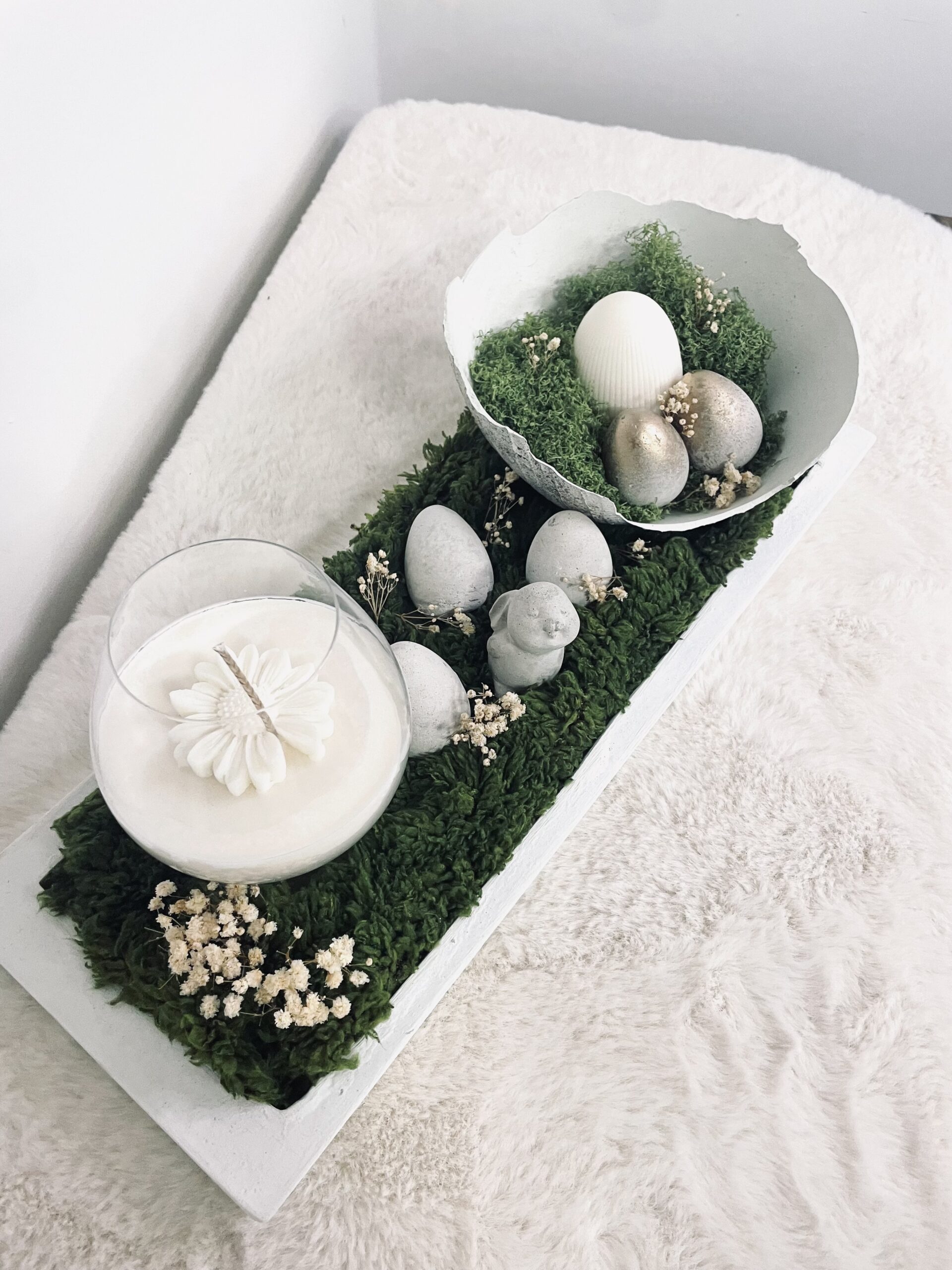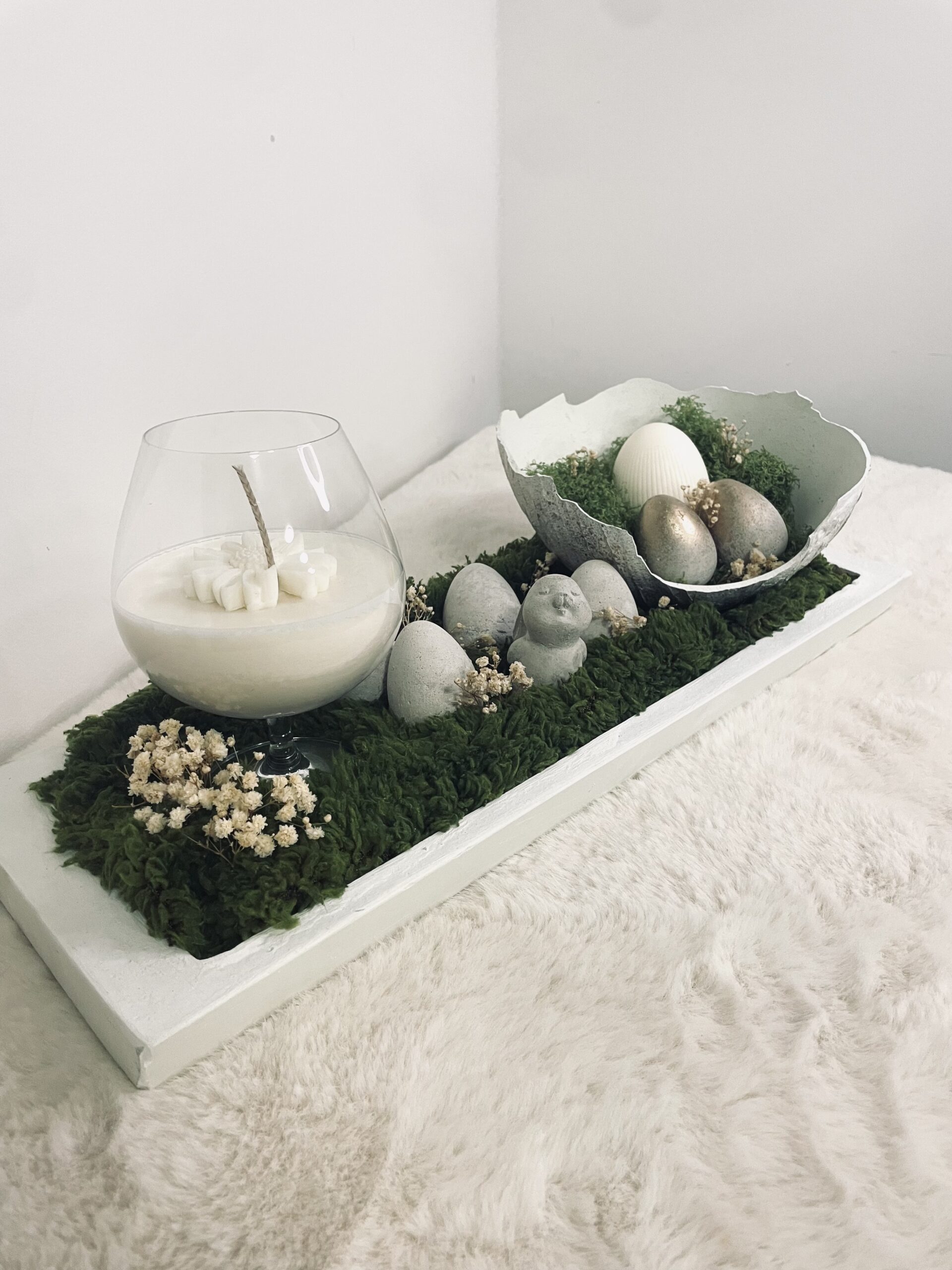 Betonové doplňky na betonovém podnose o šířce 50cm doplněné o sójovou vonnou svíčku ve skle (690ml)