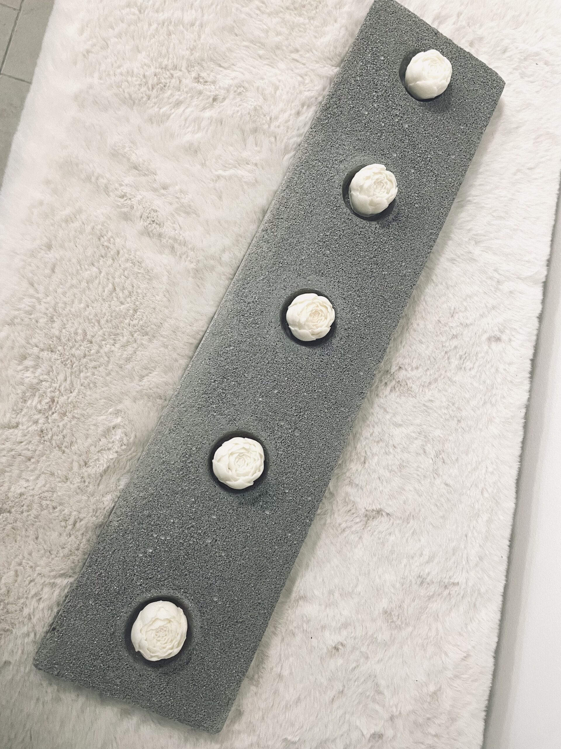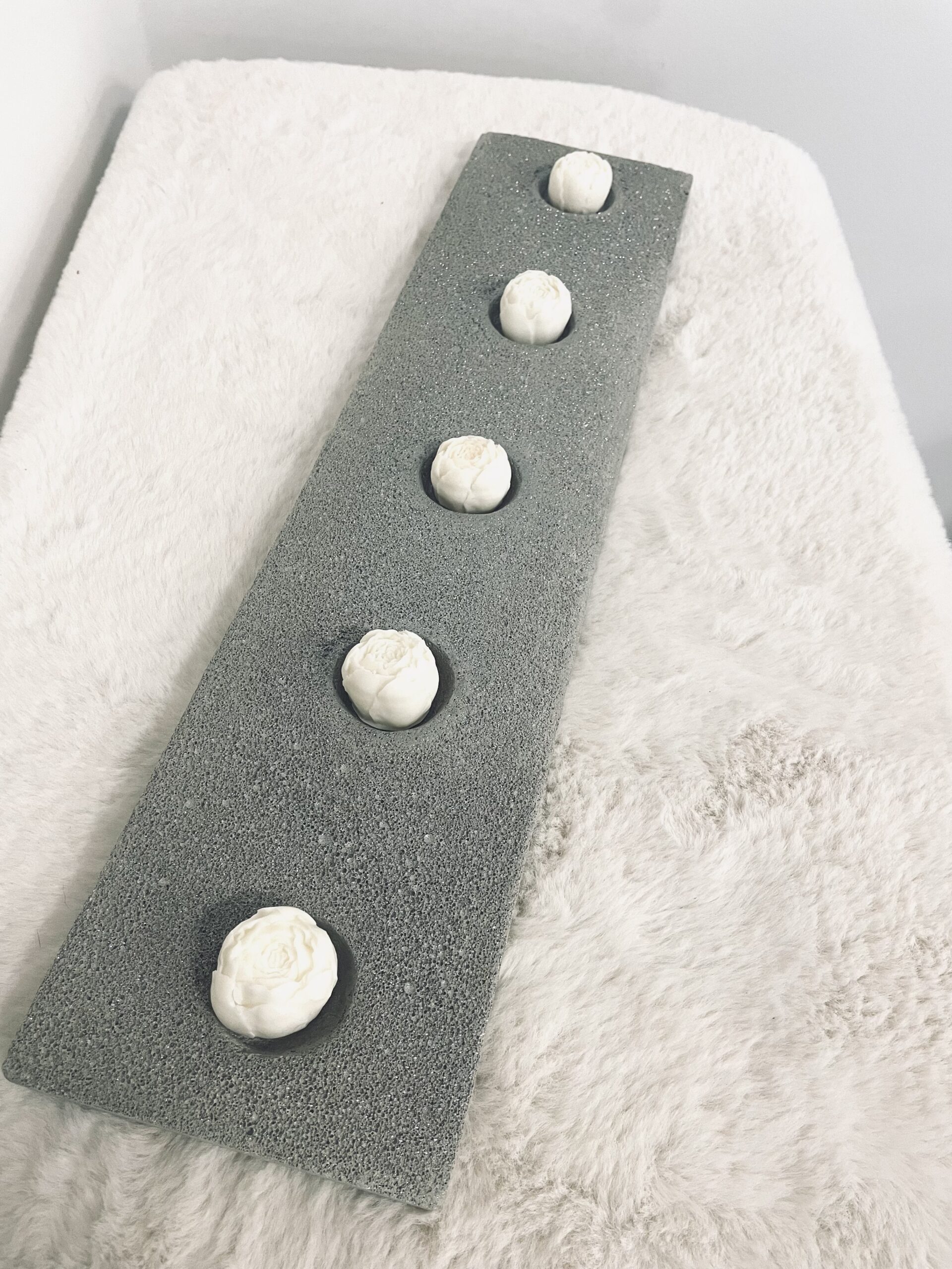 Betonový svícen o délce 60cm se sojovými svíčkami.