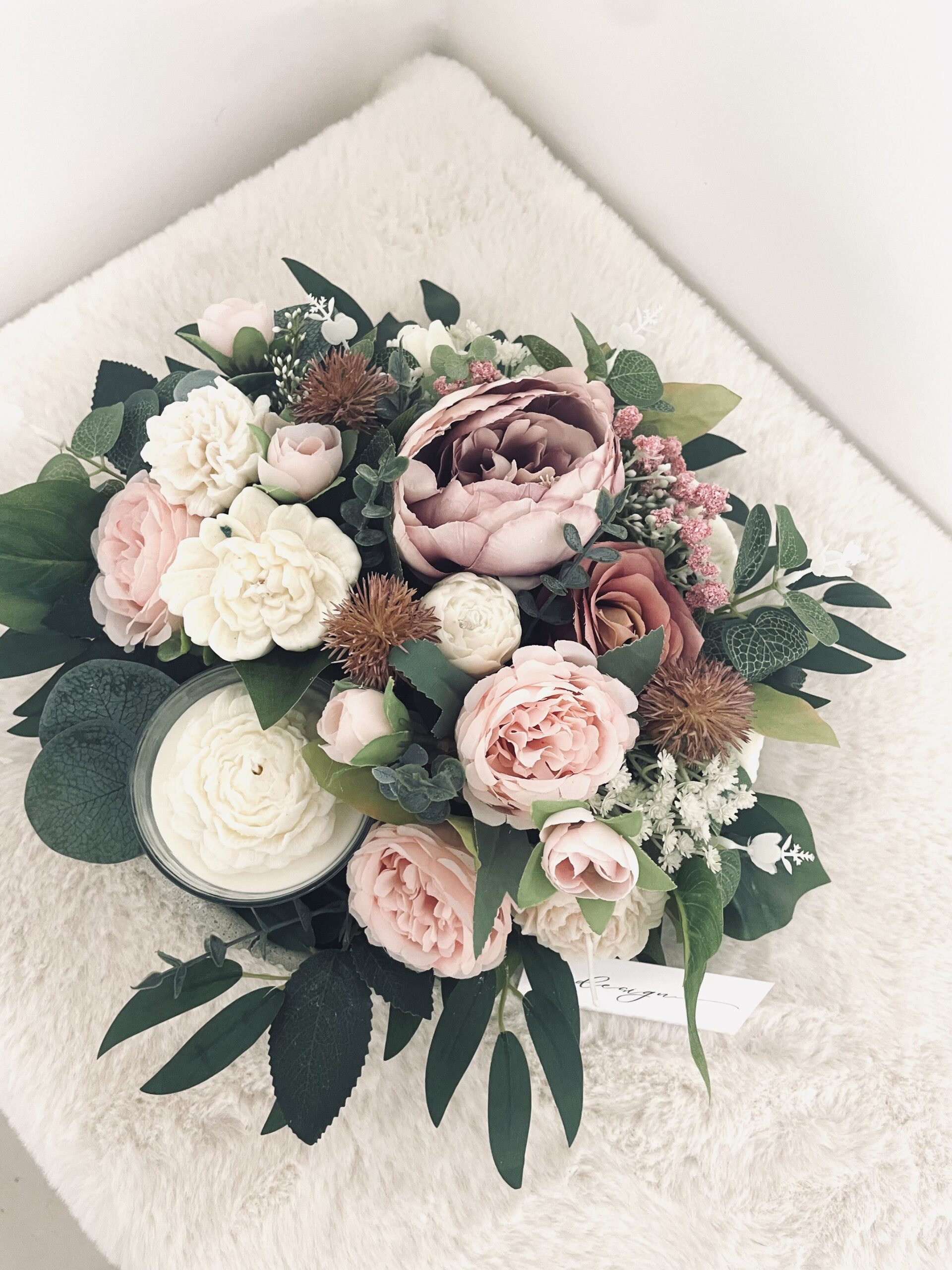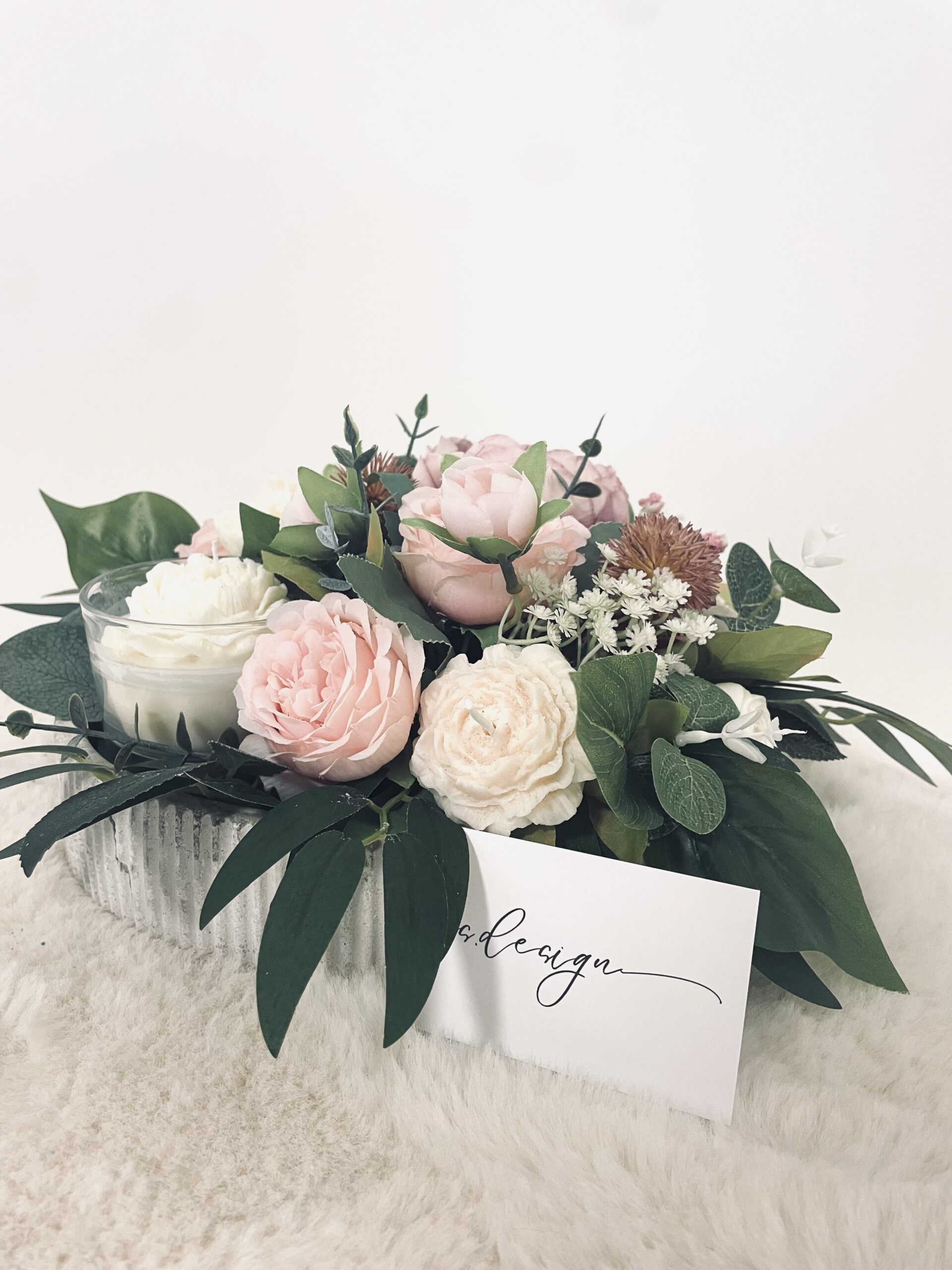 Trvanlivé květiny v betonu s vonnou svíčkou ve skle